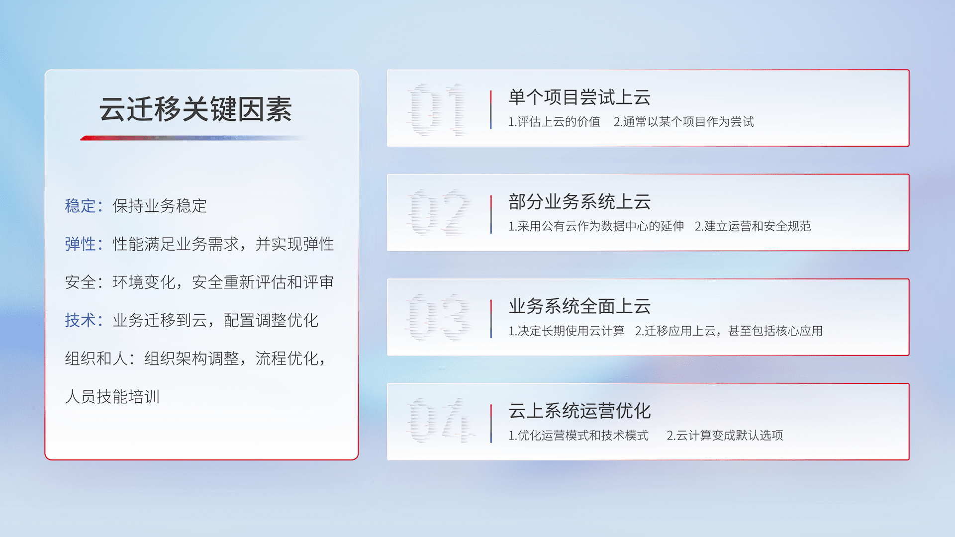结合实际业务,,从规划设计、、云平台选型、、、、云原生改造、、数据迁移、、集成交付,,迁移全过程为客户识别最佳上云路径,,,做好风险识别管理,,,设计网络架构、、、、身份权限、、、安全审计合规、、、、操作审计、、、日志审计、、、监控告警策略、、、、多站点容灾设计等,,,对云上基础设施进行整体规划,,,,提升IT治理水平,,,,以满足弹性、、、、高可用、、、高性能的需求。。。