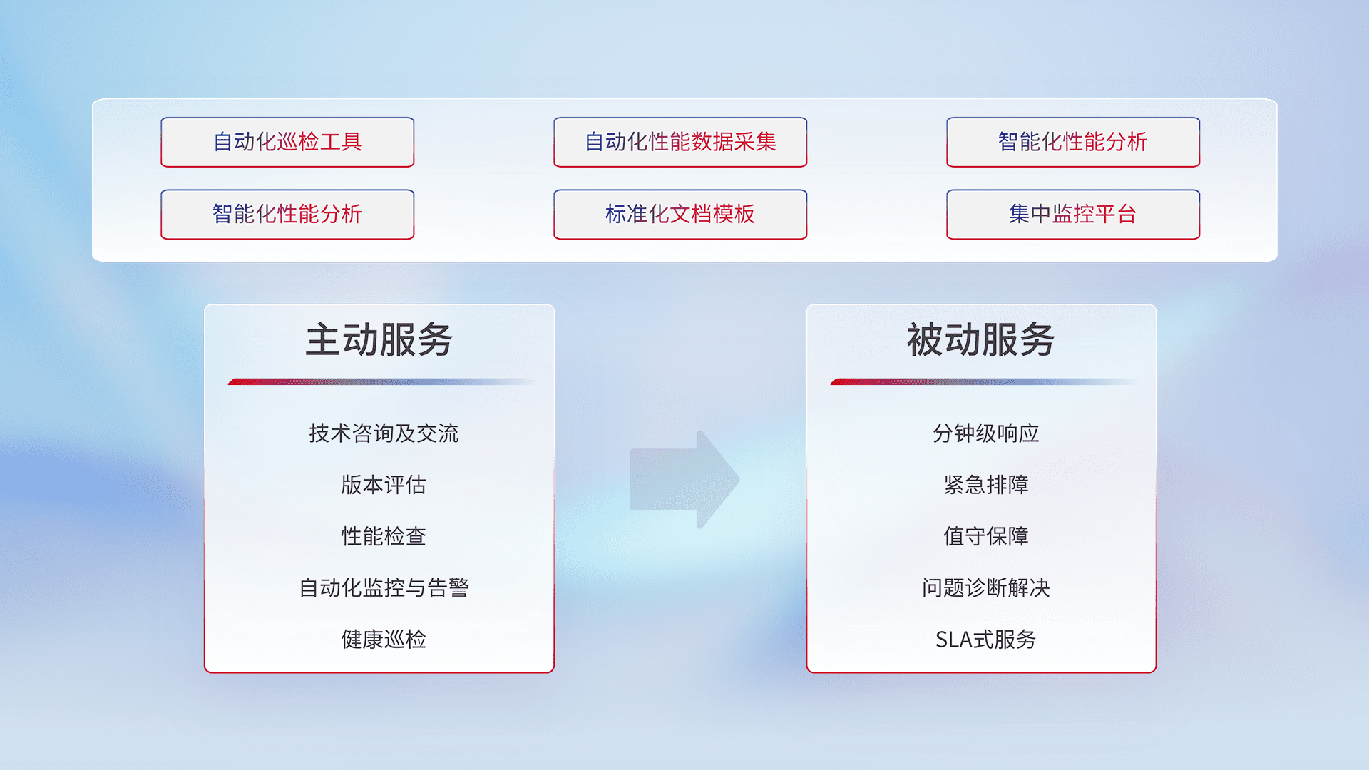 智能化工具和标准化文档,,保障服务质量,,,提供主动服务(包含技术咨询、、版本评估、、、性能检查、、、、自动化监控与告警、、健康巡检)和被动服务包含(分钟级响应、、、紧急排障、、、、值守保障、、问题诊断解决、、、、SLA服务)。。。。